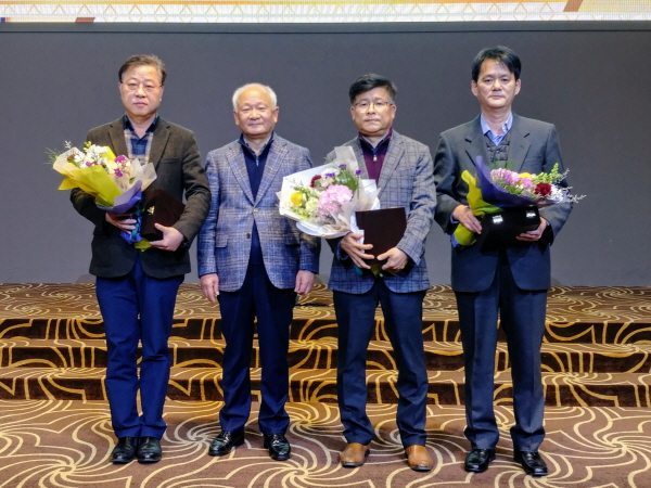 ▲ 우수기업 표창 수여식 후 수상자들과 유영목 이사장(왼쪽 두 번째)이 기념촬영을 하고 있다.