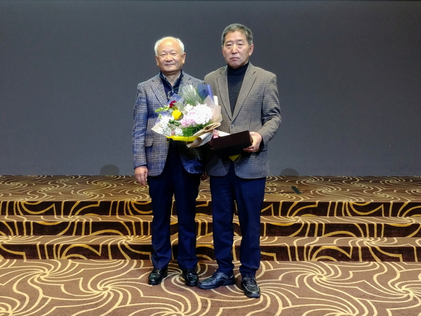 ▲ (왼쪽부터)유영목 이사장과 임노욱 전북도청 과장이 공로상 시상식 후 기념촬영을 하고 있다.