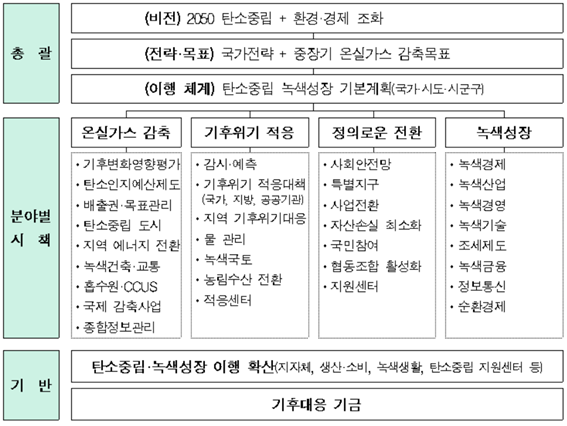 탄소중립을 달성하기 위한 국가전략, 중장기 온실가스 감축목표, 기본계획 수립 및 이행점검 등의 법정 절차를 체계화했다.