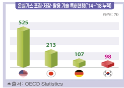 수소환원제철, 온실가스 포집·저장·활용(CCUS) 등 획기적 저감·흡수 기술확보 등 핵심 분야에서 우리나라의 경쟁력이 낮았다. 한국의 CCUS 분야 특허 건수(2014년~2018년 누적)는 98건으로 같은 기간 OECD 전체 특허 수 1,375건의 7.1%에 불과했다.