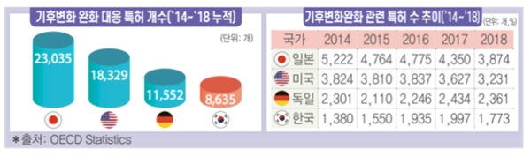 한국은 기후변화완화 대응 선도국인 미국, 일본, 독일에 비해 기후변화완화 기술 특허 수가 부족한 것으로 나타났다. 2014년부터 2018년까지 한국의 기후변화완화 기술 특허 누적 개수는 8,635개로 일본의 3분의 1 수준에 불과했다.