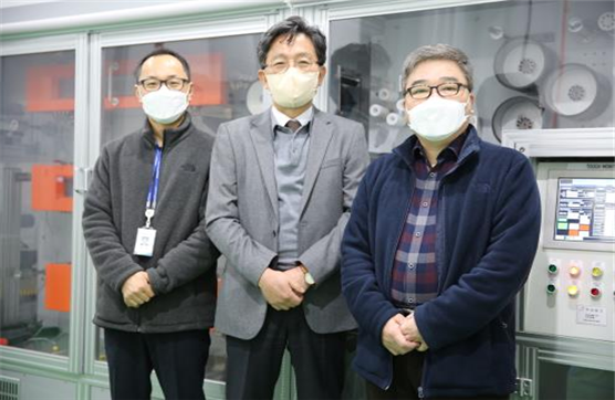 ▲ 방윤혁 한국탄소산업진흥원장(中)과 융복합연구본부 소속 김성룡 수석(右), 한문희 책임이 탄소섬유 후처리제 테스트 장비 앞에 서있다. 한국탄소산업진흥원(원장 방윤혁)이 세계 최초로 인공지능(AI)을 활용한 탄소섬유 후처리제 예측모델을 개발해 소재 개발 기간 단축을 통한 소재 자립화를 이끌어 나간다.