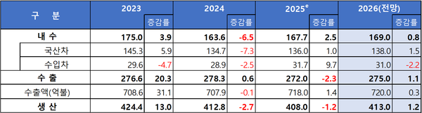 수출은 美 관세 15% 적용 확정, 입항수수료 유예 등으로 대미 통상 리스크가 완화되고, 글로벌 하이브리드 선호, 유럽 환경 규제 강화, 국내 EV 신공장 가동 본격화 등으로 증가 전환하여 275만대(+1.1%)가 예상된다.