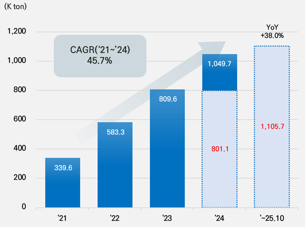 그 밖에 △Kaijin(12만 6천톤) △Shangtai(11만 4천톤) △Shinzoom(8만 3천톤) △Zichen(7만 6천톤)도 상위권에 이름을 올렸고, 대부분 전년대비 두 자릿수 성장률을 기록하며 존재감을 확대하고 있다.