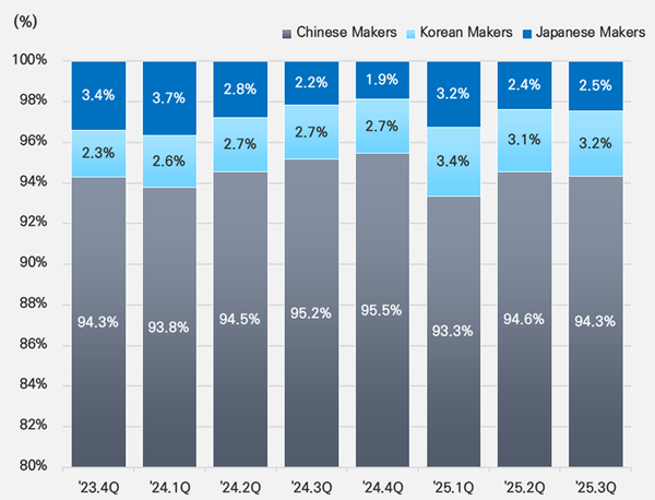 ▲ 법인 국적별 음극재 점유율 추이(출처: 2025년 11월 Global EV & Battery Monthly Tracker (Incl. LiB 4 Major Materials), SNE리서치)