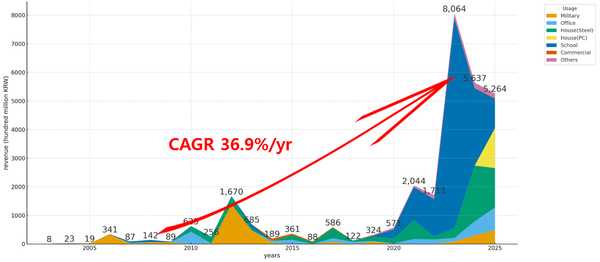 얼마 전 국회 세미나(한준호 의원, 2025.11.6)에서 모듈러 건축·주택 시장의 전망이 있었다. 2003년 신기초등학교 증축공사로 시작된 국내 모듈러 시장은 최근 5천~8천억원대 시장으로 성장하며 36.9%의 연평균 성장률(CAGR)을 보였다.