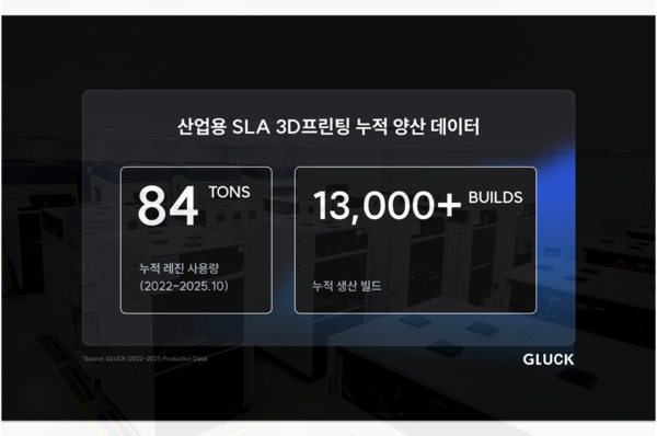글룩(대표 홍재옥)은 창사 이래 현재까지 SLA(광조형) 3D프린팅 누적 생산 제품 수가 100만 파트, 누적 레진 사용량은 84톤, 누적 생산 빌드는 약 1만3,000회를 기록했다고 27일 밝혔다. 이는 단일 출력 빌드에서 다수의 부품을 동시에 생산하는 3D프린팅 공정 특성이 반영된 결과로, 실제 산업 현장에서의 적용이 빠르게 확산되고 있음을 보여준다.