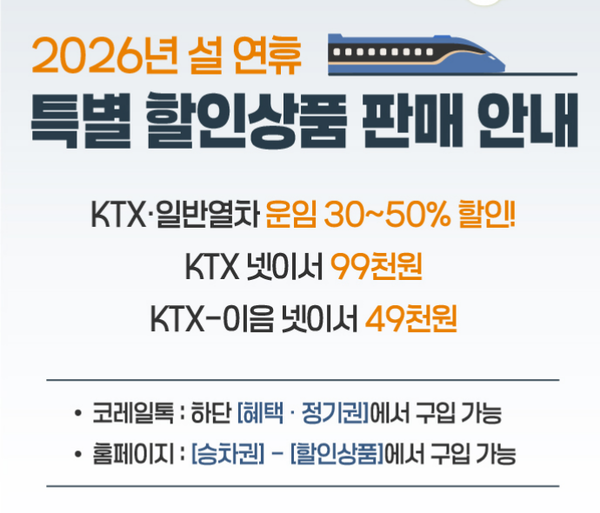 코레일(한국철도공사)은 역귀성 열차 최대 50% 할인 등 설 연휴 ‘특별 할인상품‘을 오는 6일부터 판매한다고 밝혔다.