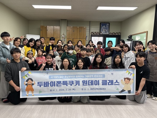 ▲ 국가철도공단 호남본부 직원들과 대촌지역아동센터 아동들이 문화체험활동을 마치고 기념촬영을 하고 있다.국가철도공단 호남본부는 겨울방학을 맞아 광주광역시 남구 소재 대촌지역아동센터를 방문해 디저트 원데이클래스와 직원 멘토링을 연계한 문화체험활동을 진행했다고 26일 밝혔다.