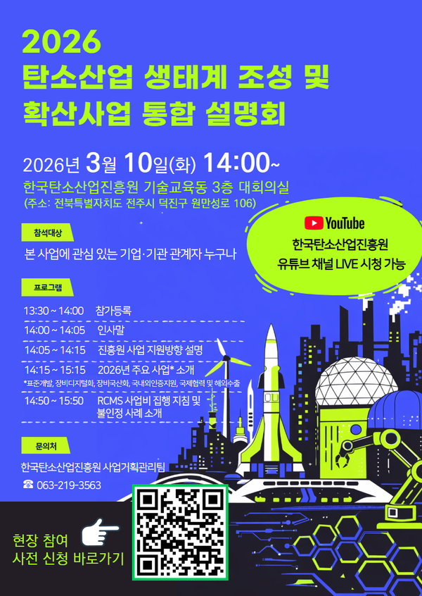 한국탄소산업진흥원(이하 진흥원)은 ‘2026년 탄소산업 생태계조성 및 확산사업 통합 설명회’를 오는 3월 10일에 진행한다고 밝혔다.