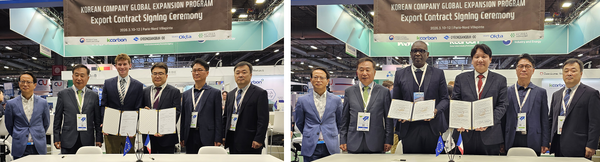 ▲ (左) 대신테크젠과 미국 N-Water사 간 CNT 나노필터 공급 계약 체결 후 기념사진을 촬영하고 있다. (右)오투엔비와 Kayo Partners사 간 그래핀 정수장치 공급 수출계약을 체결하고 기념사진을 촬영하고 있다.특히 대신테크젠과 오투엔비는 총 45만 달러 규모의 수출 계약을 체결했다. 대신테크젠은 미국 PBS International, N-Water와 각각 전자파 차폐 복합재 20만 달러와 탄소나노튜브 나노필터 10만 달러 공급 계약을 맺었으며, 오투엔비는 가봉 Kayo Partners와 15만 달러 규모의 정수 장치 공급 계약을 체결하며 아프리카 시장 진출 기반을 마련했다.