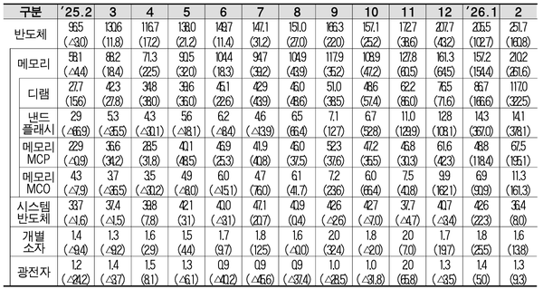 반도체는 글로벌 인공지능(AI) 서버 수요 확대에 힘입어 메모리 반도체 고정가격 상승세가 지속되고, HBM 등 고부가제품 수출이 확대되면서 월간 기준 역대 최대 수출 실적과 3개월 연속 200억 달러를 상회하는 수출 성과를 이어갔다.
