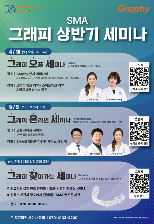 그래피(코스닥 318060, 대표 심운섭)는 지난 3월19일 성황리에 마친 ‘Graphy SMA Legends Symposium 2026’을 기점으로 Shape Memory Aligner(SMA)의 임상 적용 확대를 위한 자체 세미나 프로그램을 본격 강화하고 있다고 1일 밝혔다.