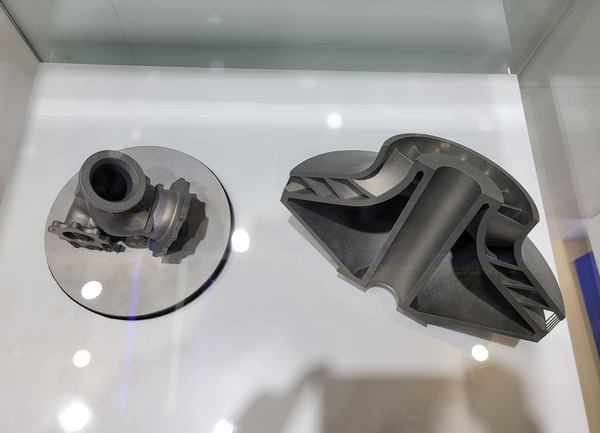 ▲ 파순이 폴리머 적층제조 장비에서 금속 제조를 함께 하는 CMF(Cold Metal Fusion)을 적용해 자사의 SLS 장비로 적층한 임펠러 금속 부품(스테인리스 316L)을 전시했다.