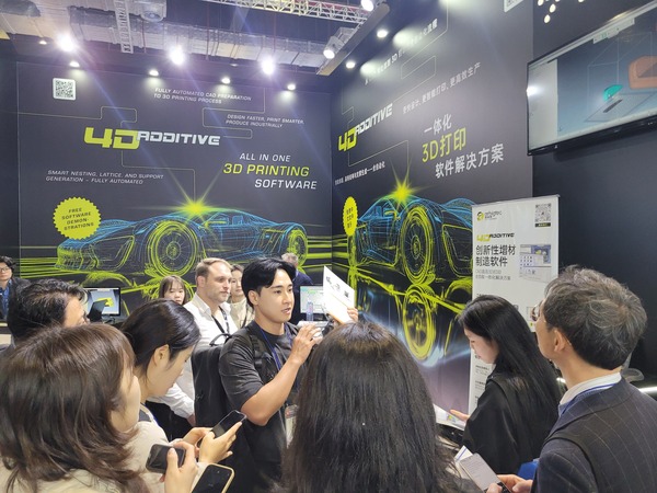 ▲ 자이브솔루션즈 백정민 차장이 CoreTechnologie의 적층제조 SW ‘4D Additive’를 TCT 아시아 참관단에게 소개하고 있다.(출처:신소재경제)이번 TCT 아시아 2026을 참관하면서 가장 크게 느낀 것은 적층제조 산업의 경쟁 기준이 예전과는 조금씩 달라지고 있다는 사실이었다. 예전에는 출력 속도, 장비 크기, 정밀도, 레이저 개수처럼 장비 사양이 먼저 비교됐다. 지금도 물론 그런 요소는 중요하다.