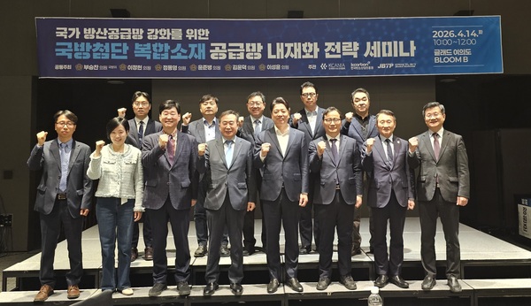 ▲ 국방첨단 복합소재 공급망 내재화 전략 세미나 참석자들이 기념사진을 촬영하고 있다.방산 산업의 고성능화에도 불구하고 핵심 소재의 수입 의존이 지속되며 공급망 취약성이 구조적 리스크로 부각되고 있다. 이에 따라 탄소복합소재 등 첨단복합소재를 중심으로 기술개발부터 인증·양산까지 이어지는 전주기 공급망 내재화와 민관 협력 기반 생태계 구축이 시급한 과제로 제기됐다.