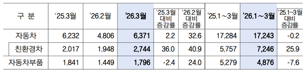 산업통상부가 지난 15일 발표한 ‘26년 3월 및 1분기 자동차 산업 실적’에 따르면 3월 자동차 수출액은 전년동월대비 2.2% 증가한 63.7억달러로 3월 기준 역대 2위 실적을 기록했다. 특히 하이브리드차 수출액이 전년동월대비 79% 증가하면서 수출 확대를 견인했다.