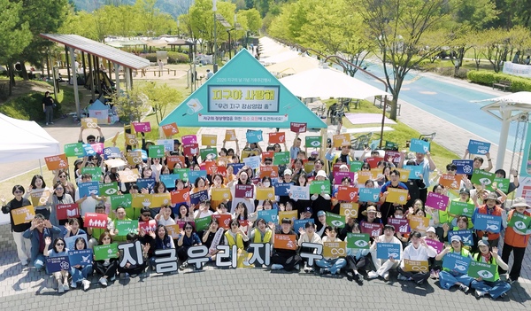 ▲ 국가철도공단 강원본부가 기후주간 행사 ‘지구야 사랑해’에 참여한 가운데, 참가자들이 기념촬영을 하고 있다.국가철도공단이 지역사회와 함께 탄소중립 문화 확산에 나섰다. 시민 참여형 체험 프로그램을 통해 친환경 철도산업과 신규 노선 홍보에 힘을 보탰다.