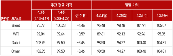 4월  넷째 주 국제유가는 호르무즈 해협을 중심으로 한 공급 불안이 상승을 견인한 가운데, 휴전 연장과 금융 변수 등이 상승폭을 제한하며 복합적인 흐름을 보였다.
