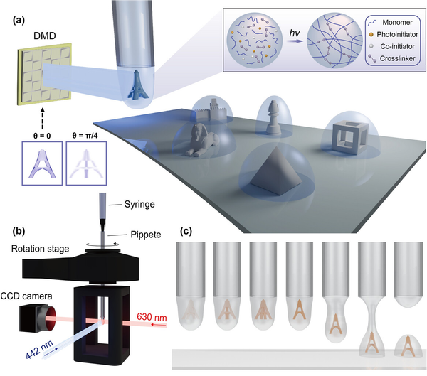 ▲ 액적 회전형 체적 3D프린팅 기술 개요. 노즐 끝에 매달린 액체 방울에 여러 각도의 빛을 조사해 방울 내부의 특정 위치만 선택적으로 굳혀 3차원 형상이 형성된다(a). 주사기와 피펫으로 액체 방울을 형성하고 카메라로 방울 형상을 관찰하면서 빛을 조사한다(b). 액체 방울이 형성된 뒤 내부에서 구조가 만들어지고, 완성된 구조물이 아래로 분리돼 연속 제작이 가능하다(c).