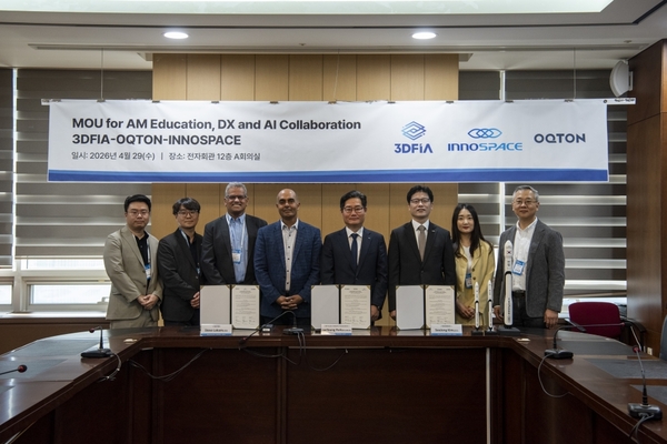 서울 마포구 전자회관에서 열린 체결식은 ‘Korea AM Technical Seminar 2026’에 앞서 진행됐으며, 3D융합산업협회 박재영 회장, 이노스페이스 김수종 대표이사, Oqton 스티브 로캄(Steve Lokam) CEO가 참석했다.