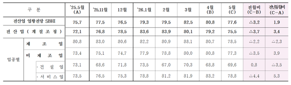 비제조업에서는 건설업(68.8→69.6)이 소폭 상승했으나, 서비스업 내 운수업(90.6→75.4, -15.2p)과 부동산업(102.4→95, -7.4p) 하락이 두드러졌다.